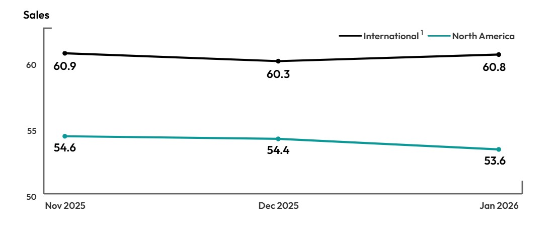 1Due to the small sample, the North American and International indexes are based on a 3-month moving average. The January 2026 index is preliminary, based on the average of January 2026 and December 2025 and will be final with February 2026 data in the next report.